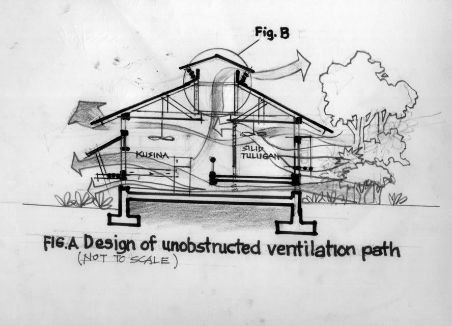 As you may recall, the first listener, Cecilio Rahon, wanted to construct an energy-efficient house and needed assistance on how the house of this OFW can be designed to make it energy-efficient. Initial drawings of a typical house adapted to the use of passive cooling system has been shown in the December 3, 2005 Kayamobato-online blog entry. More drawings on other methods of attaining an energy-efficient house will be featured on my next blogs.